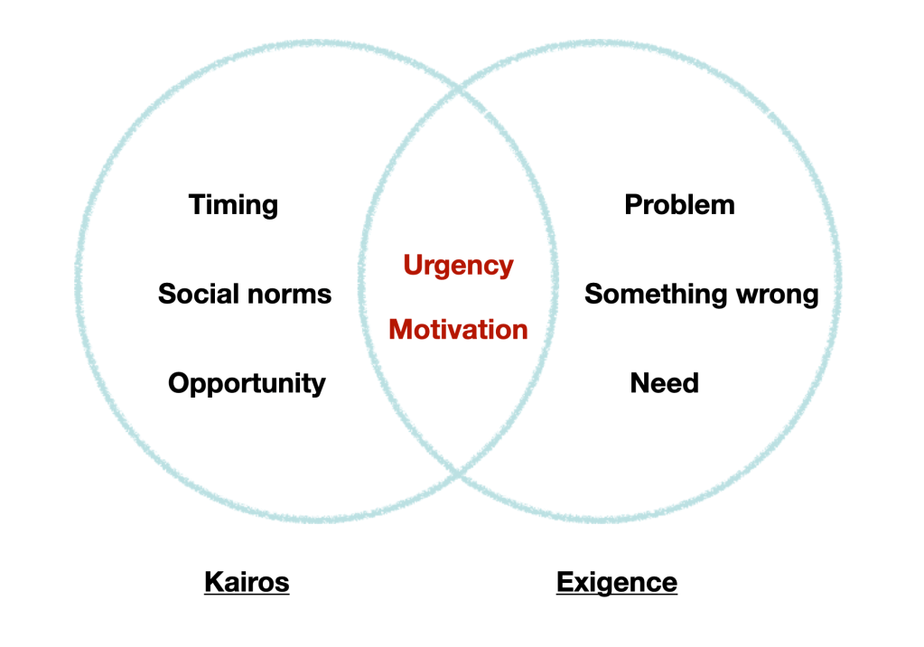 As the above excerpt shows, the Greek concept of kairos and the Roman concept of exigence are closely related. While these terms come from different social worlds and historical periods, they overlap in significant ways. I share the following Venn Diagram with my students and ask them about the similarities and differences between these concepts, an important practice for building conceptual frameworks as the authors of Learning That Transfers note. (See my previous post on analyzing conceptual relationships.)